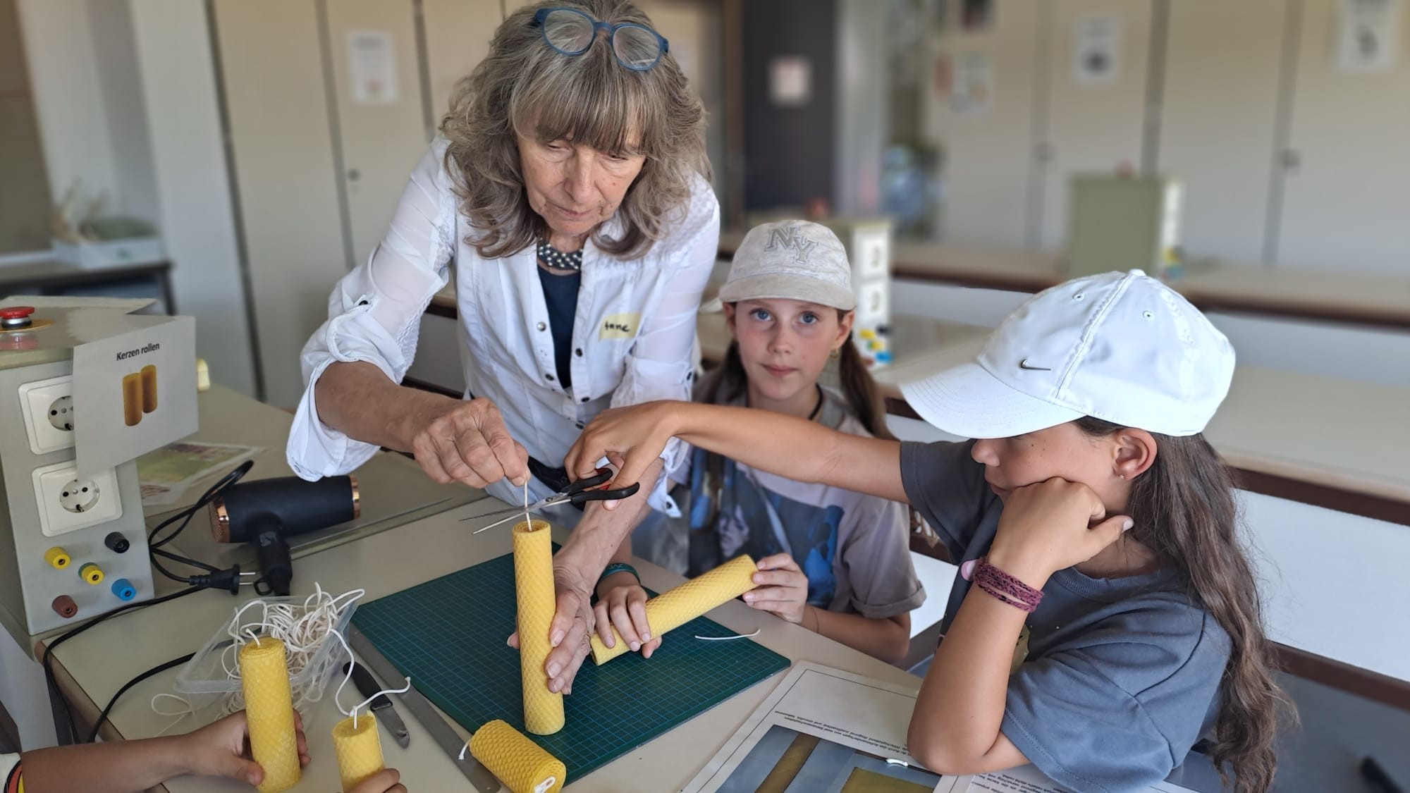 Im Anschluss konnten dann die Honigbienen etwas genauer unter die Lupe genommen werden – mithilfe von Stereolupe, Lichtmikroskop oder Becherlupe wurden die Bienen und Bienenpräparate genauer betrachtet. Vor allem die dichte Behaarung des Bienenkörpers, das eindrucksvolle Facettenauge oder der Aufbau des Stechapparates waren hier von besonderem Interesse. Auch der Hinweis auf die Vielfalt an Bienenprodukten kam nicht zu kurz und bei einer Honigverkostung konnte jeder seine Favoriten wählen oder auch feststellen, welcher Honig überhaupt nicht schmeckt. In diesem Zusammenhang wurde auch der Unterschied zwischen Blüten- und Waldhonig in den Blick genommen. Danach wurden unter Anleitung Bienenwachkerzen in unterschiedlichen Größen angefertigt. Zum Abschluss dieser Einheit konnten sich die Kinder bei einem Nektar-Sammel-Spiel in das anstrengende Leben einer Arbeiterbiene hineinversetzen.