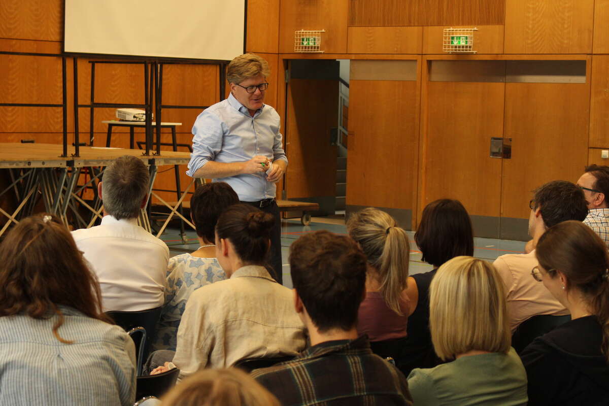 Eine besondere Verabschiedung hatte sich Axel Busch, enger Freund und langjähriger Kollege, einfallen lassen. Er hatte einen ehemaligen Referendar eingeladen, den der Pensionär vor 23 Jahren als Mentor betreute: Der bundesweit bekannte Comedian „Herr Schröder“ stand plötzlich auf der Bühne und erzählte aus dem Nähkästchen der Lehrer. „Von dir, lieber Peter, habe ich Stoff für drei Bühnenprogramme gelernt“, scherzte er – wie immer augenzwinkernd. Es war eine freudige Wiederbegegnung, die Anlass für manche Anekdote war.