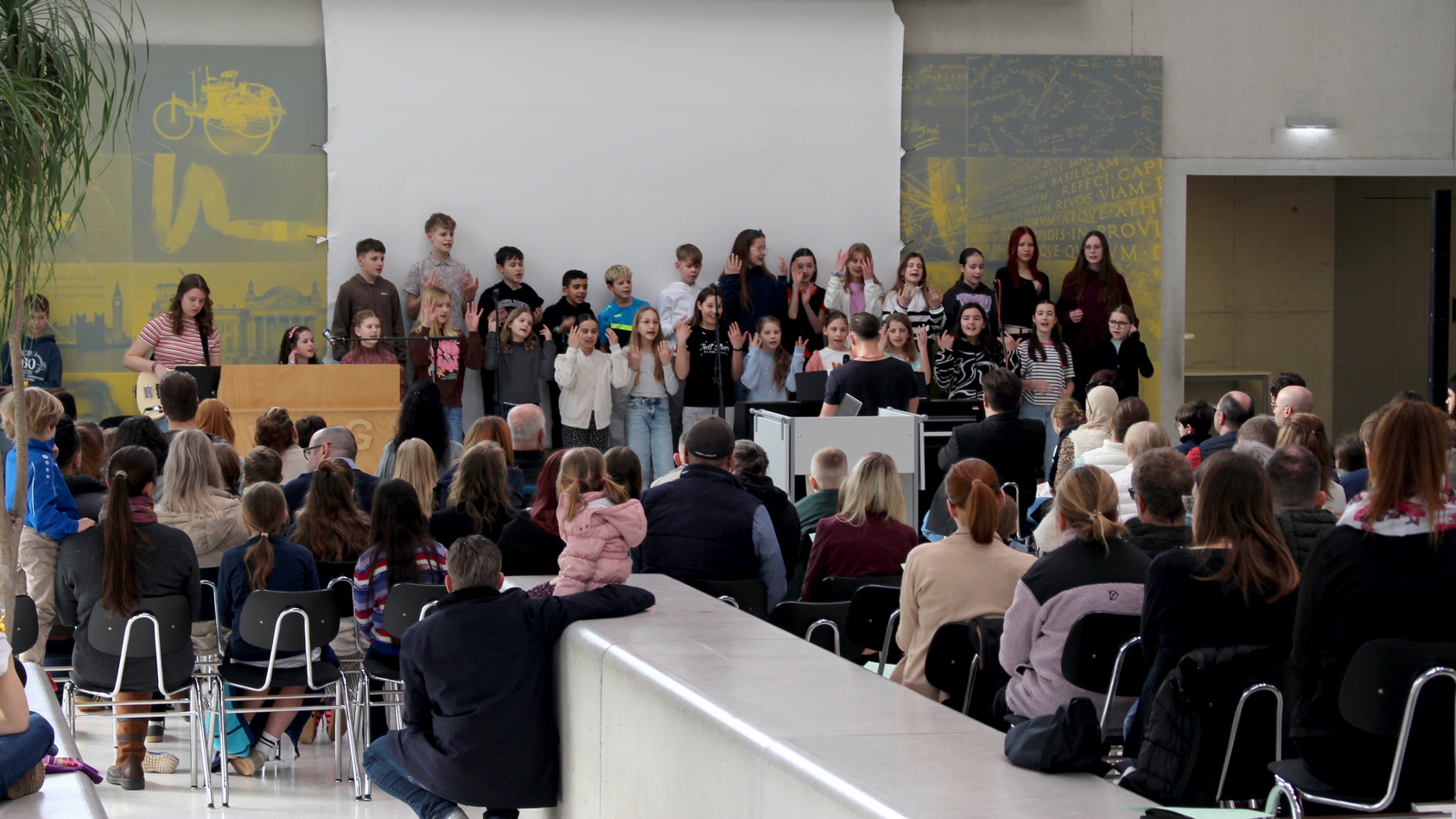 Im Mittelpunkt der Informationstage am 26. und 28. Februar standen die Kinder. Sie wurden vom Chor der Sechstklässler herzlich und musikalisch empfangen. „Die alle saßen vor gar nicht so langer Zeit da, wo ihr jetzt sitzt“, begrüßte Schulleiter Martin Klaiber die Grundschüler und Geschwisterkinder. Es beeindrucke ihn immer wieder, welch schnelle musikalische Entwicklung der Chor mache.